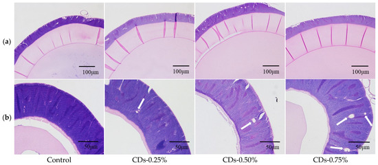 Silk glands are vital organs for silkworms to produce sericin and silk fibroin [33]. Therefore, we prepared H&E stained sections of silk glands to further analyze the effect of CDs on silkworm tissues. The silk gland mainly comprises the outer membrane, glandular cell layer and inner membrane. It is understood that the quantity of membrane vacuolization can be used to assess the degree of structural damage to the silk gland [34], where the vacuole is the structure surrounded by the epidermoid cell of the membrane [35]. According to Figure 3a,b, the silk gland of the control group had a complete morphology and the glandular cell layer was arranged neatly and densely. All CD groups had normal middle silk gland structures with thin walls and relatively full gland lumens, with no significant pathological changes (Figure 3a). However, the posterior silk glands of the CD groups had different degrees of vacuoles (Figure 3b, white arrows); the number of vacuoles in the posterior silk glands increased as the CD dose increased, especially in the CDs-0.75% group. This phenomenon may be due to the accumulation of CD particles mainly in the posterior silk glands [17]. From a biological point of view, nanoparticles are small enough to interact with the cells of living organisms. When exogenous nanoparticles enter an organism, the nanoparticle surface is immediately wrapped by biomolecules such as proteins, organic matter and enzymes, forming a new binding body called the protein crown [36]. A nanobio interface is created between the biomolecules and nanoparticles, and this process affects protein synthesis and secretion to some extent. The high concentration of protein adsorbed on the nanoparticle surface can increase the partial unfolding of proteins, and the interactions between nanoparticles and proteins may also lead to protein agglomeration and the production of harmful products, such as amyloid deformation [37]. An irreversible change in protein structure is the main molecular mechanism causing the damage, which also explains the pathology of the posterior silk glands of the silkworm during the late feeding period.