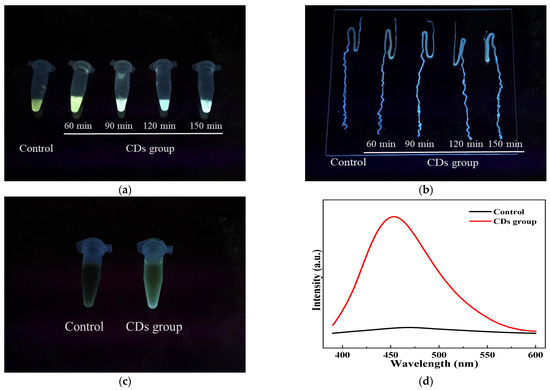 Shortening silkworm feeding cycle and improving the additive conversion efficiency are crucial for optimizing the feeding method. Thus, we dissected the silkworms at different points after feeding to investigate the CD uptake and distribution in silkworm tissues and the CD excretion, which will provide new ideas for optimizing the feeding cycle of additives. It was observed that the silkworm blood had a bright yellowish fluorescence after feeding silkworms with a CD-modified diet for 60 min. It changed from the original yellowish color to blue–white after 90 min of feeding (Figure 5a). After approximately 90 min of feeding, the silk glands showed bright blue–white fluorescence (Figure 5b). This indicated that a large number of CDs had diffused into the glandular lumen of the silk glands from blood. The CD absorption and distribution in silkworm bodies were tentatively demonstrated by the changes in the fluorescence phenomena of tissues using the UVP gel imaging system, which indicated that CDs could quickly and efficiently accumulate in the silk glands, and this change became evident after feeding for 90 min. This is similar to the absorption process of other fluorescent dyes, such as rhodamine B, which is rapidly absorbed by most tissues of the silkworm body, and this change becomes apparent within the first 2 h and saturates within a day [39]. CDs rapidly enter silkworms and accumulate in their blood and silk glands, which allows the feeding cycle to be shortened. This means that to produce fluorescent silks, the silkworms only need to be fed CDs on the sixth day of the fifth instar. Previous research has shown that some dye compounds, such as rhodamine B hexyl ester and acridine orange, were firmly retained without significantly excretion, which caused silkworm death within three days [39]. Thus, we collected silkworm feces after feeding the silkworms a CD-modified diet for 12 h to detect CD excretion from the silkworm. The silkworm feces aqueous extract showed the same blue fluorescence as CD solution under UV light (Figure 5c) and exhibited an intense emission peak centered at 453 nm when exposed to a 370 nm laser (Figure 5d). Therefore, we concluded that the fluorescence of the silkworm feces aqueous extract originated from CDs. The excretion of CDs avoids the toxicity that may result from excessive accumulation.
