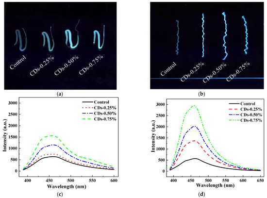 We further investigated the CD distribution in the silk gland under different CD doses. When exposed to UV light, the middle and posterior silk glands of the control group exhibited weak fluorescence, while the silk glands of the CD groups exhibited strong blue–white fluorescence (Figure 6a,b). As the CD mass fraction ratio reached up to 0.50%, the whole silk glands showed bright blue–white fluorescence. The middle and posterior silk glands of the CD groups showed a strong emission peak at 460 nm, the intensity of which increased as the CD dose increased (Figure 6c,d). Only a weak, broad emission peak could be seen in the control group. The fluorescence emission spectra confirmed that the photoluminescence intensity of the posterior silk glands was significantly higher than that of the middle silk glands, illustrating that CDs were most likely located within the posterior silk glands. The fluorescence intensity of the silk glands of the CD groups was dose-dependent. Among them, the CDs-0.75% group had the greatest and most uniform fluorescence intensity. The CDs in this work exhibited an intense emission peak center at 467 nm (Figure 1d). Hence, the fluorescent properties of the silk glands originated from the CDs, and the silkworms could uptake a certain quantity of CD and maintain a certain CD content during the processes of concentration and spinning, causing the modified silk to have an intrinsic blue fluorescence [17]. It has been observed that hydrophilicity, lipophilicity, and the structures created following molecular self-assembly are the factors influencing the distribution of substances in silk [2]. The hydrophilic ligands on the CD surface can interact with the hydrophilic polypeptide chains of sericin and effectively transfer CDs to sericin and fibroin. Therefore, CDs can be distributed in both sericin and fibroin and result in fluorescence.