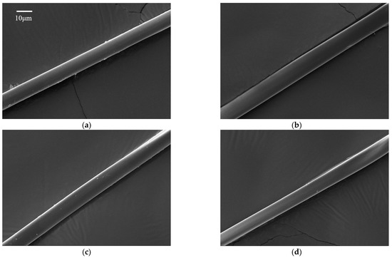 SEM images of silk fibroin fiber: (a) control, (b) CDs-0.25%, (c) CDs-0.50% and (d) CDs-0.75%.