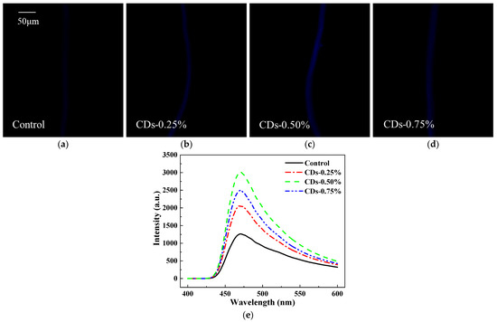Effect of CDs on the fluorescent intensity of silk fibroin fiber. (a–d) Confocal laser microscopy images of silk fibroin fiber (measured with an excitation wavelength of 405 nm); (e) PL spectra of silk fibroin fiber (measured with an excitation wavelength of 370 nm).