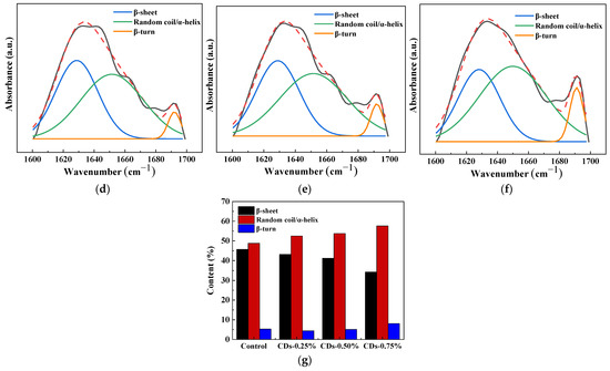 Effect of CDs on the mechanical properties of silk fiber. (a) Stress–strain curves of silk fiber; (b) FT-IR spectra of silk fibroin fiber; the deconvolution of FT-IR spectra in the amide I bands of (c) control, (d) CDs-0.25%, (e) CDs-0.50% and (f) CDs-0.75%. (g) Contents of secondary structures obtained based on the amide I bands in FT-IR spectra.