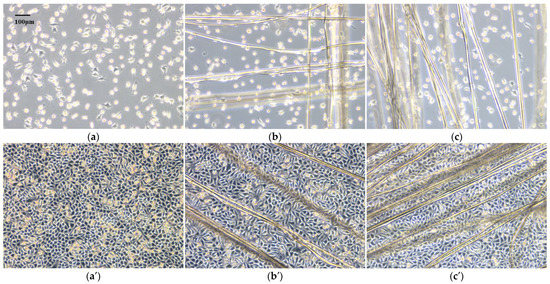 Growth and proliferation of L929 cells on silk scaffolds. L929 cells cultured for 24 h on coverslip (a), control (b), and CDs-0.50% silk scaffolds (c); L929 cells cultured for 72 h on coverslip (a′), control (b′) and CDs-0.50% silk scaffolds (c′).