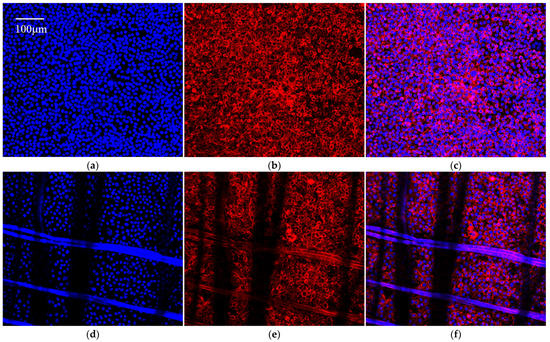 Fluorescent pictures of cells on silk scaffolds were captured by laser confocal microscopy. The cells were planted and cultivated on the silk scaffolds for 72 h. The matrices were then washed two times with PBS to remove excess serum, followed by incubation in 4% paraformaldehyde for 10 min. The samples were permeabilized for 10 min at room temperature with 0.50% Triton X-100. The constructs were first stained with DAPI for 30 min at room temperature and then incubated with rhodamine–phalloidin solution for 30 min. Using a confocal laser scanning microscope, fluorescence pictures of stained constructs were captured (ZEISS, LS M880, Oberkochen, Germany). The laser wavelength of DAPI was 405 nm and that of rhodamine–phalloidin was 559 nm.