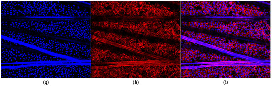 LSCM images of L929 cells cultured for 72 h on coverslip (a–c), control (d–f) and CDs-0.50% silk scaffolds (g–i); (a,d,g) L929 cells/silk scaffolds stained with DAPI; (b,e,h) L929 cells/silk scaffolds stained with rhodamine–phalloidin; (c,f,i) L929 cells/silk scaffolds stained with DAPI and rhodamine–phalloidin.
