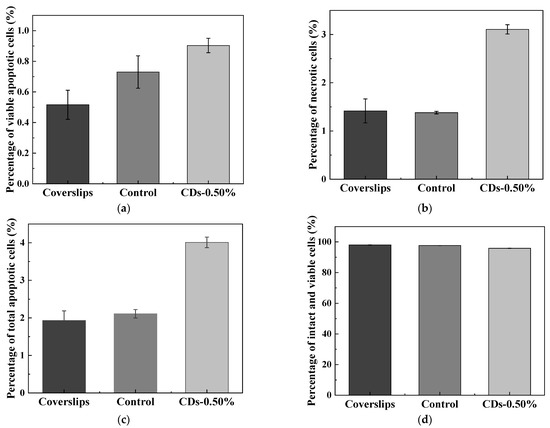 Silkworm silk as a natural material has been extensively used as a biological scaffold. The use of fluorescent silk as scaffolds can improve the visualization of tissue scaffolds and the interface between scaffolds and cells for easy monitoring of scaffold function [17]. In this work, we created silk scaffolds by encircling silk fibroin fibers around a coverslip to culture L929 cells (Figure 10). After seeding for 24 and 72 h, the cell morphologies of L929 cells on different substrates were similar. The L929 cells grew well with a clear cell outline and showed spindle-like or flattened morphologies (Figure 11). After staining with DAPI and rhodamine–phalloidin, the L929 cells showed intact nuclei and a clearly structured cytoskeleton (Figure 12). The laser scanning confocal microscopy (LSCM) images further confirmed that the good cytocompatibility of silkworm silks was retained by the CD-modified silks. After 72 h of cell culture, flow cytometry was used to further examine the apoptotic statuses of the L929 cells on silk scaffolds. The results showed that the percentages of viable apoptotic cells on different substrates were all less than 1% (Figure 13a). The percentages of necrotic cells on the coverslip and control silk scaffolds were both less than 1.50%, and that on the CDs-0.50% silk scaffolds was slightly higher at 3.1% (Figure 13b). The percentages of total apoptotic cells on the coverslip, control and CDs-0.50% silk scaffolds were 1.9, 2.1 and 4.0%, respectively (Figure 13c). Finally, the percentages of intact and viable cells on the coverslip, control and CDs-0.50% silk scaffolds were more than 98, 97 and 96%, respectively (Figure 13d), which suggested that CD-modified silks had no cytotoxicity. We further observed the adhesion of L929 cells on the CD-modified silks by SEM. The SEM images showed that a large number of cells adhered to both the control silk scaffolds and CDs-0.50% silk scaffolds after culturing for 72 h (Figure 14). The excellent cytocompatibility and good mechanical properties of the CD-modified silks had a positive impact on cell adhesion and culture, which endowed the modified silks with application potential in tissue engineering. Ultimately, CD-modified silks with good mechanical properties, intrinsically fluorescent properties and excellent biocompatibility might motivate new applications in tissue engineering, fluorescent fabrics and other fields.
