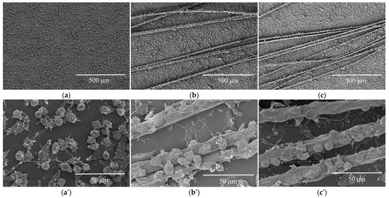 SEM images of L929 cells cultured for 72 h on (a,a′) coverslip, (b,b′) control and (c,c′) CDs-0.50% silk scaffolds.