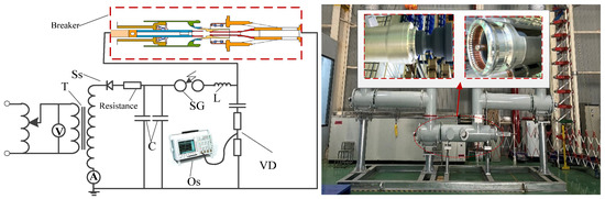 The opening and closing tests were conducted in the high-power test station (50MVA, Shandong Taikai High Voltage Switchgear Co., Ltd, Taian, China) with a high electrical life capacitor bank circuit breaker. The main diagram of the test circuit is shown in Figure 1.
