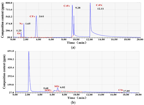 Test results of gas in the test switch. (a) PDD1 chromatogram. (b) PDD2 chromatogram.