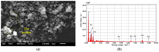 Since the circuit breaker completed more than 1300 breaking tests and the breaking tests failed, the gas’s composition is analyzed in Table 2, and a large number of powdery solid decomposition products were deposited in the arc-extinguishing chamber. The solid decomposition products were collected from the arc-extinguishing chamber for detection and analysis with an electron microscope. The tungsten filament scanning electron microscope in the laboratory was used to observe appearances and morphologies, and the results are shown in Figure 4. At the same time, the samples were detected and analyzed with a field emission electron microscope.
