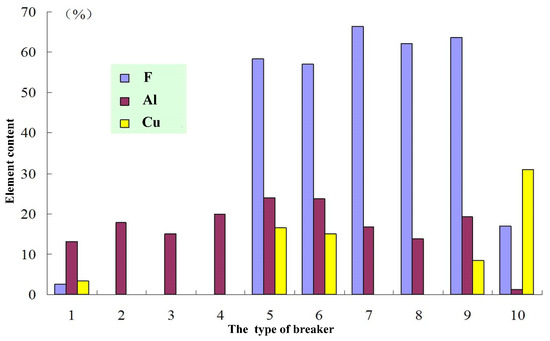 The solid powder samples collected from circuit breakers under different working conditions were compared and analyzed, and the elements contained in the detected solid samples were counted, mainly including F, Al, Cu, W, Fe, C, S, O, Si, etc. The detection results of the solid decomposition products of the above three types of equipment (eight circuit breakers) are listed in Table 8. F, Al, and Cu are the main elements, and the percentage of each element is shown in Figure 8. Corresponding to the equipment’s working conditions, 1−4 in the figure are normal operation circuit breakers, 5−8 are fault circuit breakers, and 9−10 are test circuit breakers. It shows that the solid powder in the circuit breaker comprises mainly metal fluoride.