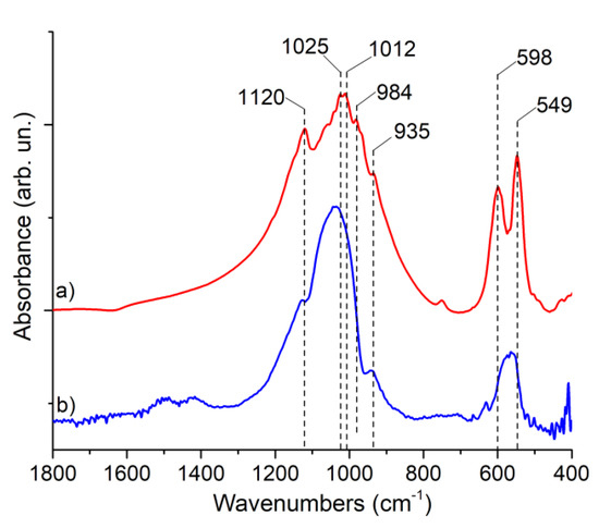 In Figure 3, the FTIR spectra of the target and coatings are presented. In the FTIR spectrum of the target (Figure 3a), it is possible to observe typical β-TCP features. All signals are related to the PO43− group; peaks at 549 and 598 cm−1 can be referred to as the ν4 bending mode, peaks at 935 and 984 cm−1 to the ν1 symmetrical stretching mode, and peaks at 1012, 1025, and 1120 cm−1 to the ν3 anti-symmetrical stretching mode, respectively. The shift of each band with respect to the respective signal of pure β-TCP can be related to Mn and Sr substitutions. In the spectrum of the film deposited on Si, the two phosphate ν4 bending modes converge in a single band, suggesting the low crystallinity of the composite films. Moreover, low-intensity signals at 1420 and 1500 cm−1 suggest the formation of a small amount of carbonated calcium phosphate, which is typical for the PLD deposition procedure.