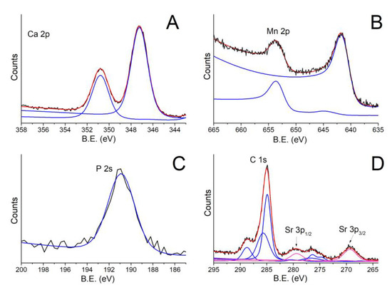 XPS spectra of Mn,Sr-TCP coating deposited on Zn-Li alloy: (A) Ca2p; (B) Mn2p; (C) P2s; (D) C1s-Sr2p. In the figure, black, red and blue lines represent the experimental data, the fitting curves and the peak components, respectively.