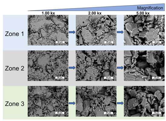 SEM images of different zones of Mn,Sr-TCP powder at various magnifications.