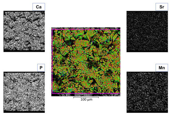 Mn,Sr-TCP powder is characterized by coarse granules with sizes ranging from tens to hundreds of microns (see Figure 5). The highest magnification allows the individuation of finer particles on the surface of coarse granules. The finest particulate size ranges from hundreds of nanometers to a few microns. The SEM-EDX analysis proved the presence of Mn and Sr and a homogeneous distribution of all the elements in the prepared Mn,Sr-TCP powder (see Figure 6).