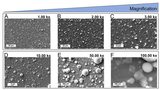 Films deposited on Si substrates were uniform and compact, with round and irregularly shaped microparticles resting atop the nanostructured background (see Figure 7A–C). The presence of the gas buffer (O2) in the deposition chamber and a short target substrate distance (1 cm) led to the confinement of the laser-induced plasma and promoted nucleation and growth of clusters and nanoparticles. Moreover, plasma confinement supported the growth of crystalline domains, transforming the diffuse contour of amorphous particles to sharp-edged ones. Surface characterization of Mn,Sr-TCP coating deposited on Zn-Li alloy is reported in Figure 7D–F. It is characterized by a uniform nanotextured background with globular-shaped particles on it (10 kx image). Some particles underwent coalescence, resulting in flattened round structures up to a few microns. Images collected at higher magnifications (50 and 100 kx) revealed that globular-shaped particles have a size distribution ranging from tenths of nanometers up to few microns and are randomly distributed on the surface.