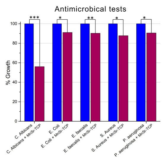 Growth rate of four bacteria (S. aureus, E. coli, S. typhimurium, and E. faecalis) and one fungus (C. albicans) grown in the presence and absence of Mn,Sr-TCP Zn-Li samples. The percentage of growth is calculated from three independent experiments. Statistical significance is reported for each bacterial group: *** (p < 0.001), ** (p < 0.01), * (p < 0.05).