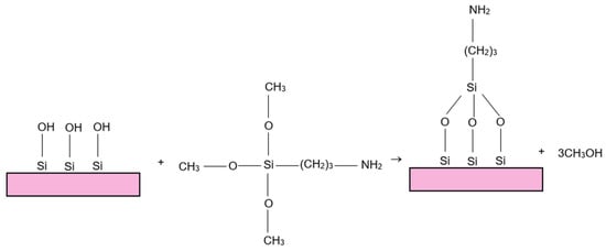 Pre-treatment with amino-3-methoxy silane (APTMS): We used the procedure described in ref. [55] to adjust the isoelectric point (IEP) of the silica particles. The surface of the particles was covered with amino groups by means of this method. Thus, the isoelectric point of the particles changed from pH ≈ 2.5 [56] to pH ≈ 9.2. This is due to a chemical reaction between amino-3-methoxy silane (APTMS) and Si–OH groups. The silica particles were positioned in 1 mol/L NaOH (T= 60 °C) and stirred. After that, they were flushed with DI water and soaked in a mixture of 100 mL ethanol + 2 cm3 amino-3-methoxy silane (APTMS) for 24 h (T= 60 °C). Finally, they were rinsed with DI water. Figure 1 shows the chemical reaction on the surface of the silica particles. Figure 1 indicates the presence of amino groups on the chains, which were attached to the silica particles. Due to their presence, the isoelectric point was observed at pH = 9.2. We tested the foamability of 20 ppm MIBC at different pH values and constant ionic strength (I = 7.5 × 10−4 mol/L) in the absence and presence of 1 wt.% modified -10 μm silica particles.