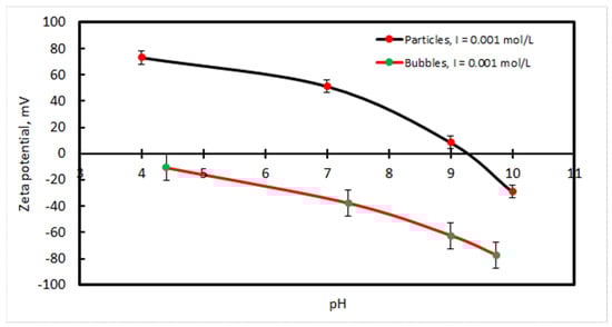The intrinsic isoelectric point (IEP) of the silica particles was at pH ≈ 2.5 [56]. The isoelectric point (IEP) of the modified silica particles was at pH ≈ 9.2. Figure 2 shows the zeta potential of the modified silica particles and microbubbles [57] versus pH at I = 10−3 mol/L. One can see that the microbubbles and the modified silica particles were oppositely charged (ξb = −22 mV, ξp = 60 mV) at pH = 5.8. The procedure did not affect the hydrophobicity of the silica particles (CA ≈ 30°).