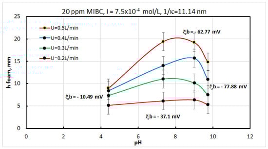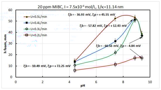 Figure 3 shows the height of the froth column of the aqueous solution of 20 ppm MIBC vs. the pH value at constant ionic strength I = 7.5 × 10−4 mol/L and different gas delivery rates. This ionic strength corresponded to the Debye length 1/κ = 11.14 nm. This indicates that the bubbles could repel each other at approx. 33.5 nm distance from each other. Three times the Debye length practically corresponded to the thickness of the diffuse layer. One can see in the figure that the height of the froth increased with the increase in the pH value until reaching the maximum at a certain pH value in the range of pH = 8 to pH = 9. This is easy to explain by increasing the electrostatic repulsion between the bubbles—their absolute value of the zeta potential increased with the increase in the pH value.