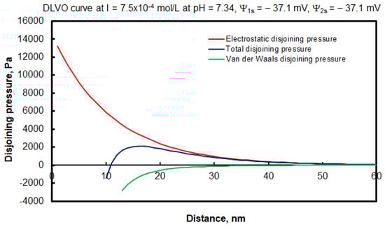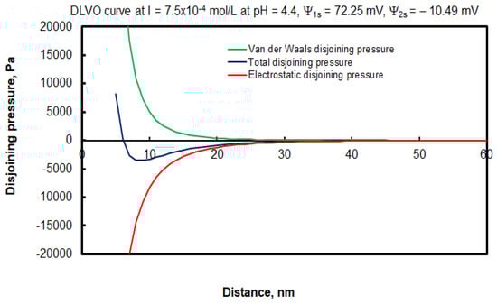 Figure 6 shows the DLVO curves of the electrostatic, van der Waals, and the total disjoining pressure vs. distance between the bubbles and the modified silica particles at ionic strength I = 7.5 × 10−4 mol/L and at pH = 4.4. One can see that the total disjoining pressure became negative at a distance below 20 nm.