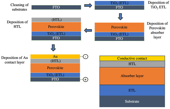 A standard PSC structure typically consists of multiple layers of thin films that include the conductive contact layer, hole transporting layer, perovskite as an absorber layer, an electron transport layer, and the substrate [32,33]. Figure 2 depicts the most common deposition sequence of a standard PSC. A fluorine- or indium-doped tin oxide is usually used as the substrate layer for the PSCs. The thin layer of ETL in this case, TiO2, is first deposited on the cleaned substrate, followed by the deposition of the perovskite absorber layer. Another thin layer of hole-transporting material, for example, spiro-OMeTAD, is then deposited, and to complete the whole structure, a final layer of conductive contact is deposited. The layers are stacked together while ensuring that the band alignment of the heterojunction is in accordance with its distinct device configurations. Despite the device configurations, the incorporation of ETL seems to be the most effective way of improving the overall performance of PSCs [34,35].