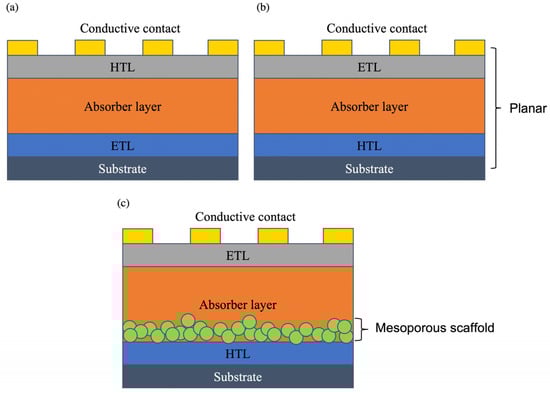 (a) Conventional PSC structure; (b) inverted PSC structure; (c) mesoporous PSC structure.