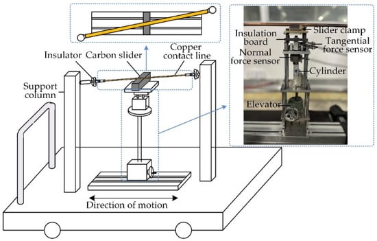 23]. The copper contact line is at an angle of 15 °C in a horizontal direction and is fixed between the support column through the insulator and the contact line clamp. The carbon slider is installed in the fixture of the moving parts, which can slide reciprocally under the contact line through the linear guide rail to simulate the “Z” movement of the pantograph-contact line systems. The effective travel of the linear guide rail is 500 mm, and the operating frequency is continuously adjustable from 0.3–6 Hz. A cylinder is arranged directly below the slider fixing device, which can provide a 0–500 N continuously adjustable load for C-Cu contacts. The matching AC/DC current source can provide 0–200 A continuously adjustable AC/DC current for C-Cu contacts.