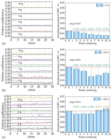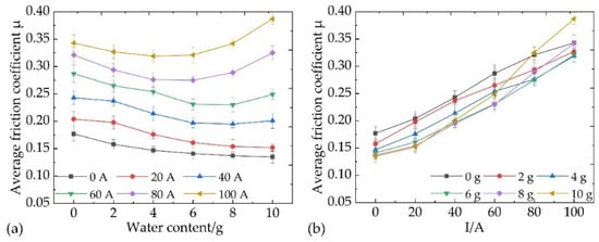 3.1. Influence of Water Content on Friction and Wear under Different Current