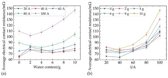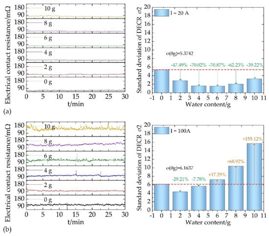 Figure 6. When the current is 20 A, the fiducial value of DECR corresponding to 0 g of water content is the lowest, but its fluctuation degree is the highest in terms of the standard deviation. When the water content reached 2 g, the DECR shifted upward, but the fluctuation degree of DECR decreased significantly. With a further increase in water content, DECR shifted downward, and the fluctuation degree gradually decreased. When the water content is greater than 6 g, the DECR basically stabilizes around 75 mΩ. However, the fluctuation of the DECR was the weakest when the water content was 6 g, and then the fluctuation was aggravated with an increase in water content. When the current reaches 100 A, DECR corresponding to 0–2 g water content fluctuates around about 110 mΩ, and DECR gradually shifts upward with a further increase in water content. The fluctuation degree of DECR reached the minimum value at 2 g water content and then increased rapidly with the increase in water content. The fluctuation degree of DECR corresponding to 10 g water content is increased by 155.12% compared with the case at 0 g water content.