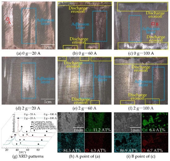 Figure 8g), which comes from the material transfer of the copper contact wire. When the water content is 0 g, the amount of copper transfer on the carbon surface decreases with the increase in current. However, it is found from the EDS spectra that the larger the current, the more overlap the enrichment areas of copper and oxygen elements, which indicates a higher degree of copper oxidation (