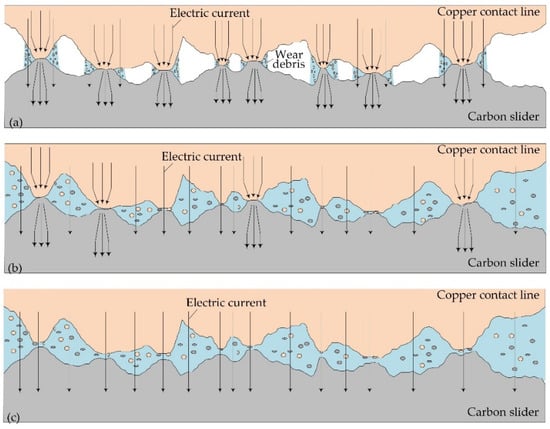 Figure 10b,c), the contact spots that can transmit current gradually decrease. When the water film completely covers the contact surface, current transmission can barely be completed in the case of a low current. However, at higher current levels, the conducting particles in the water film cannot undertake the task of current transmission. At this time, a high contact voltage drop is generated, accompanied by an intensified arc discharge. The wear loss of the carbon slider is significantly increased due to discharge erosion, which is consistent with the change in wear loss in