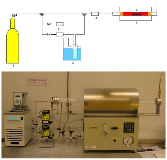 Scheme (top) of high-temperature helium in the test system and the real facility (bottom): 1. Gas cylinder; 2. Two mass flow controllers; 3. Unit for controlled gas humidification; 4. Moisture analyzer (Hygrometer); 5. Tube furnace with a metal retort; 6. Sample holder; 7. Gas outlet/gas sampling point.