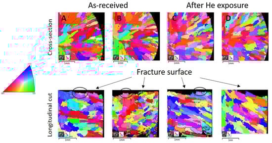 The EBSD maps of the as-received materials after tensile testing show large grains elongated in the radial direction of the cross-section with a decrease in grain sizes towards the specimen’s surface. The maps of the exposed materials after tensile testing show a similar grain structure. No significant extension of the grains was observed along the longitudinal direction after tensile testing, whereas a dendritic fracture was observed. In addition, the recrystallized structure was observed in the grains near the fracture surface in the longitudinal cut, marked by black ellipses in Figure 2.
