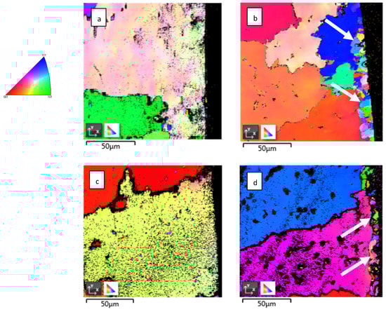 EBSD measurements were used to compare the crystallographic structure before and after exposure to high temperature, specifically the structure of grains after tensile testing and the misorientation inside the grains close to the fracture surface. Figure 2a–d displays the EBSD maps in Euler angles of both materials in the cross-section and longitudinal directions of the sample in low magnification.