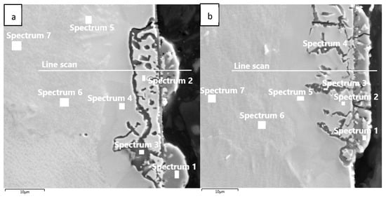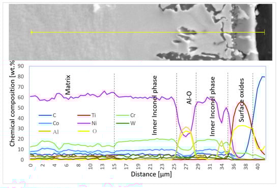 After He exposure, a 10–20 µm thick layer was observed close to the surface and is marked with black dashed arrows in Figure 4b,d. This layer is probably a new phase that likely arose during the exposure of the virgin material, as shown in the EDX analysis Figure 5, Figure 6 and Figure 7. The layer has an obviously distinct microstructure from the inner regions of the material. Apparently, this layer experienced the dissolution of the γ‘ precipitates. Further, surface protrusions marked with white arrows and a thin surface layer marked with full-line black arrows were probably formed by the interaction of the material with gaseous impurities in high-temperature He.