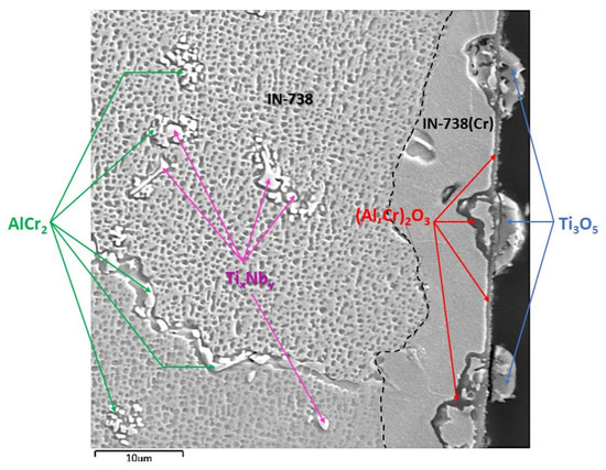 SEM–BSE image of IN738 100R after He exposure showing phases, layers and particles, with the composition identified by XRD.