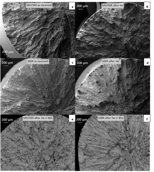 SEM–BSE micrographs of fractures in tensile specimens: (a) 50R as-received; (b) 50R after He exposure; (c) 100R as-received; (d) 100R after He exposure; (e) 50R after He exposure in BSE; (f) 100R after He exposure in BSE contrast.