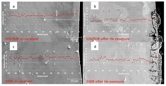 Nanoindentation performed in the cross-section: (a) as-received 50R; (b) 50R after He exposure; (c) as-received 100R; (d) 100R after He exposure.