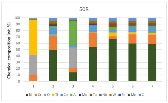 In the EDX analysis, the chemical mapping of the samples after the 50R and 100R materials were exposed to He can be seen in Figure 5 and Figure 6, respectively. The fine-grained layer at the surface (Figure 4, marked with dashed arrows) is enriched with Cr, Co, Mo and depleted of Ni, Ti and Al elements (see Figure 5 and Figure 6). Such inner phase of similar composition does not occur in common nickel-based alloys, which do not contain Co [11,14]. The surface protrusions (Figure 4, marked with white full-line arrows) are Ti, Cr and Al-containing oxides. The thin surface layer (Figure 4, marked with black full-line arrows) is likely Al-based oxide scale. Al-oxide-rich regions are also found below the surface protrusions. Particles (Ti, Nb, Ta)C are visible in Figure 5 and Figure 6d, and probably Cr23C6 is seen at the grain boundaries on Figure 6.