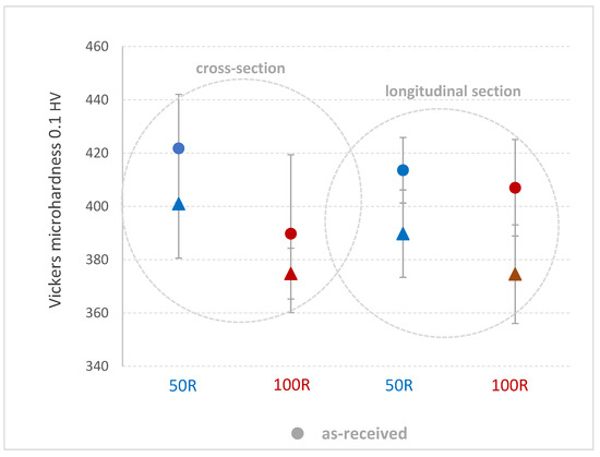 Vickers microhardness HV0.1 was measured after the tensile tests on a longitudinal and cross-sectional plane from the edge across the center of the sample in five lines, each line with five indents. Table 3 shows the average values, where a slight decrease of microhardness after He exposure is observed along the cross-section and longitudinal direction on both 50R and 100R specimens. However, a higher scatter of values should still be considered (Diagram 6).