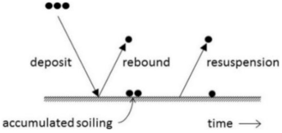 Dust deposition includes three processes: deposition, rebound, and resuspension according to Figure 3 [27,28,29]. The deposition and removal of particles was previously studied using microscopic photography and videography. The characteristics of dust deposition are influenced by wind flow, air humidity, the installation method of PV modules, the particle diameter and composition, and other environmental factors [30]. The increase in dust deposition velocity will promote the deposition rate of dust particles. However, dust particles that contact photovoltaic modules are easy to bounce off the surface under high wind velocity. In addition, higher wind velocities can affect deposition, causing an increase in the resuspension rate and the fraction of recombination [31]. Additionally, resuspension will occur when the lift force is greater than the forces that hold the particles to the surface (interception, gravity, and mass inertia [32]).