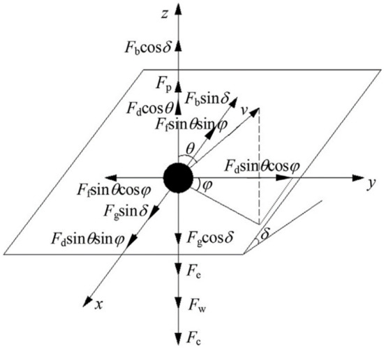 Figure 4 illustrates the forces on the particles during the collision. The dust deposition process is closely linked to the action of these forces. The origin is set as the contact point between the particle and the PV plate. The space rectangular coordinate system with the z-axis as the normal direction of the contact surface is established [35]. The forces (liquid pressure, gravity, etc.) that can cause particles to be deposited on the inner inclined panel are referred to as deposition forces. The separation force refers to the resistance and contact force that can cause the particles to leave the panel. A deposition force greater than the separation force will result in the particles being deposited on the panel. Analysis of these forces will help to provide insight into the deposition behavior of the dust and how the dust is re-removed. As particle size decreases, liquid evaporation will greatly accelerate the agglomeration and fouling process of particles [36].