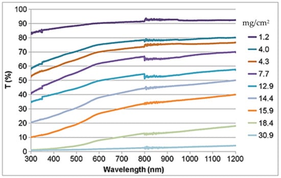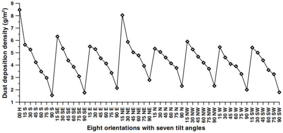 The reduction of normal spectral transmittance of PV glass cover is related to dust density and inclination angle of photovoltaic modules [31,50,51,52,53,54,55,56,57,58,59]. It can be seen from Figure 6 that the higher the dust deposition density, the more serious the reduction of transmissivity. There is a linear correlation between the deposition density and power loss in the process of dust deposition [54]. However, when dust deposition is heavy enough, the linear correlation no longer exists [28]. Elminir et al. [60] studied the effect of dust deposition density in eight directions and six tilt angles, as shown in Figure 7. It is found that an increase in tilt angle decreases the dust particle deposition density on the PV modules and that dust is more easily deposited on horizontal surfaces than on tilted surfaces [61]. After one month of horizontal and vertical exposure, the transmittance of the two glass covers decreased to 30% and 88%, respectively [62]. Lu et al. predicted the dust accumulation on PV panels by numerical simulation and obtained similar conclusions [63]. Yao et al. [64] obtained that dust affects the dust particle density on the PV panels in various ways by testing the dust density under natural conditions. The functional relationship between the tilt angle of the glass cover and dust density is concluded.