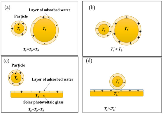 When the photovoltaic module is working, an electrostatic field will be formed and dust particles will be polarized and charged, which is called the electrostatic effect. Charged dust particles on photovoltaic modules will absorb dust particles in the air, resulting in more serious dust deposition [5,20,62]. Liu et al. studied the mechanism and properties of dust deposition on solar photovoltaic modules under electrostatic action. Figure 8 illustrates the principle and mechanism. It was found that frequent collision can transfer physical charges, which can charge both objects, affecting the behavior of dust deposition [63]. The initial temperature of the electron-neutral sand is the same, Ta = Tb = T0. Ta refers to the temperature of particle a, Tb refers to the temperature of the particle b, and T0 refers to the initial temperature of particles a and b. The internal energy conversion caused by the collision will cause the temperature rise of the particles. The ion concentration in the adsorbed water film was increased. Ions will migrate from hot to cold particles through the contact interface. The hot particles have a negative charge, and the low temperature has a positive charge.