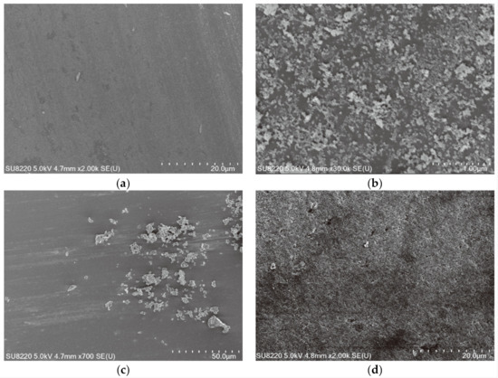 SEM images of the glass surfaces without/with super-hydrophobic coating before/after dust deposition [100]. (a) Glass without super-hydrophobic coating before dust deposition; (b) Glass with super-hydrophobic coating before dust deposition; (c) Glass without super-hydrophobic coating after dust deposition; (d) Glass with super-hydrophobic coating after dust deposition.
