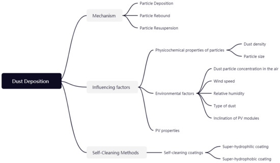 A flow chart that explains the dust deposition mechanism, influencing factors, and self-cleaning methods.