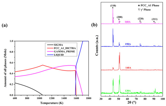Simulation of the phase compositions of the CuNiCoCr alloy by CALPHAD (a) and XRD patterns of the Cu35Ni25Co25Cr15 HEA coatings deposited under different welding currents (b).