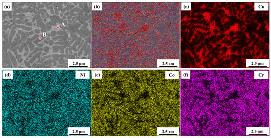 Microstructures and compositions of the Cu35Ni25Co25Cr15 HEA coating deposited under a welding current of 140 A: (a) microstructure; (b) distribution of all elements; (c–f) distribution of Cu, Ni, Co, and Cr, respectively.