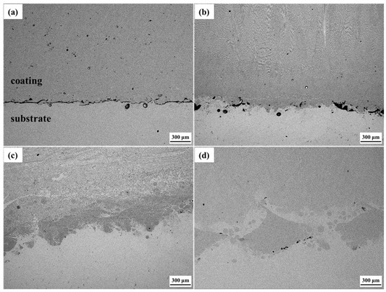 Microstructures of the interfacial zone between the Cu substrate and Cu35Ni25Co25Cr15 HEA coating deposited under different welding currents: (a) 130 A; (b) 140 A; (c) 150 A; (d) 160 A.